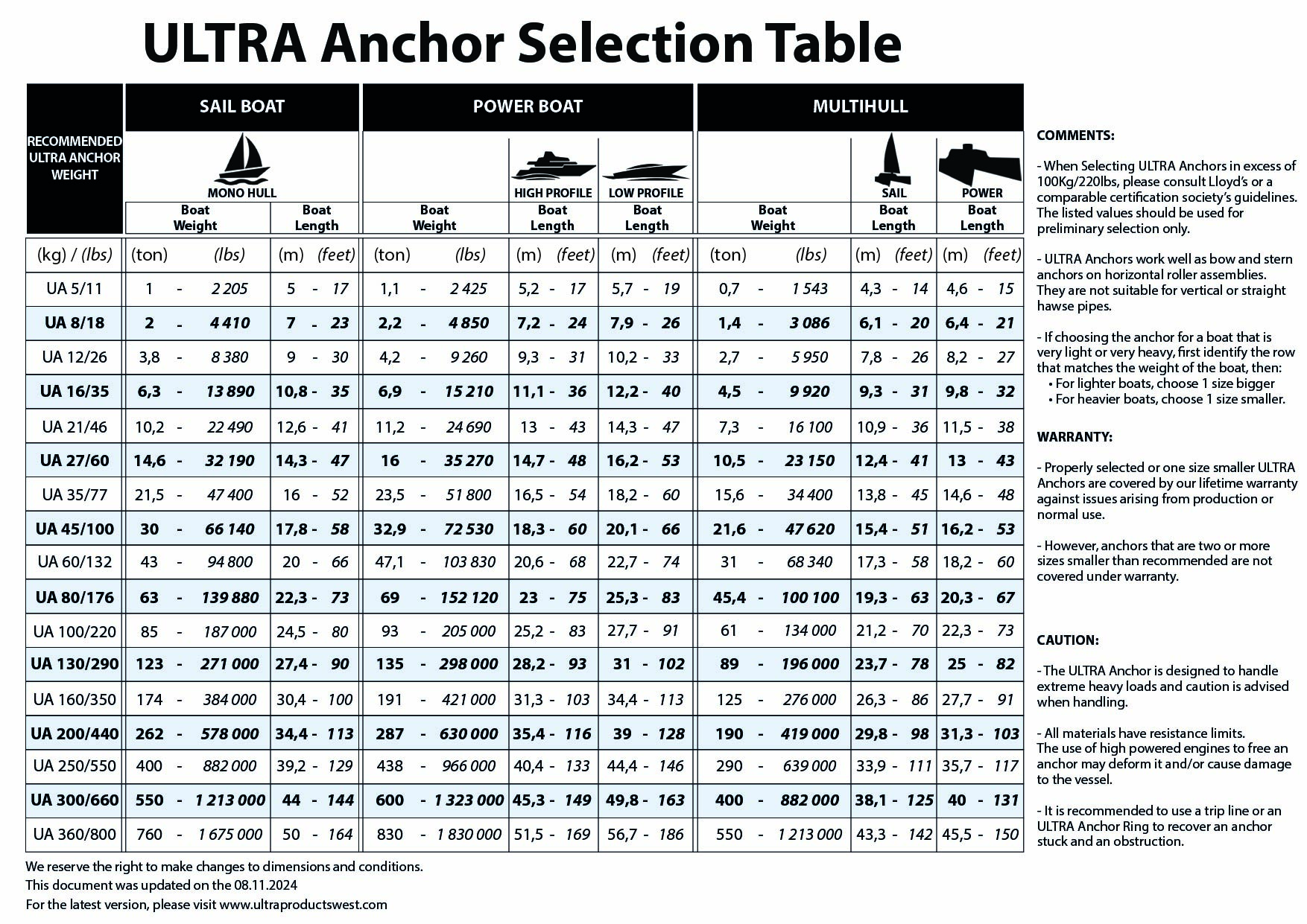 - When selecting ULTRA Anchors in excess of 100Kg/220lbs, please consult Lloyd’s or a comparable certification society’s guidelines. The listed values should be used for preliminary selection only.
